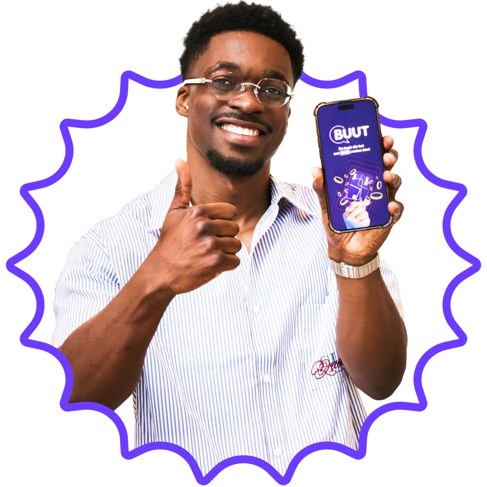 BUUT is de nieuwe bank van de makers van Tikkie. Speciaal voor tieners van 10 tot en met 16 jaar én hun ouders (9-jarigen mogen ook beginnen als ze willen). Want met BUUT leren ze veilig sparen en betalen met potjes. Nu met €25 starttegoed en 3% rente, zie actievoorwaarden.